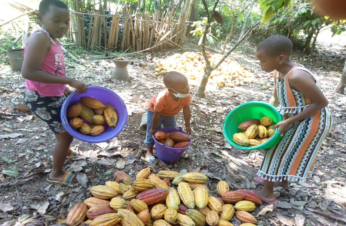 Children carrying cocoa pods in a cocoa garden this act is prohibited by Hannie chocolate